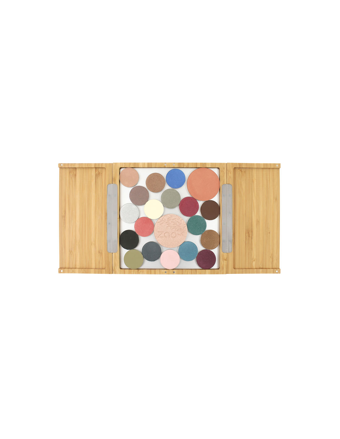 Avec ZAO Make-up, composez, selon vos envies, votre palette de maquillage personnalisée avec le boîtier “bamboo box XL” rechargeable. Facile à créer, son fond aimanté permet d’organiser vos fards à paupières, fards à joues, terre cuite minérale, poudres à sourcils, poudre compacte, …