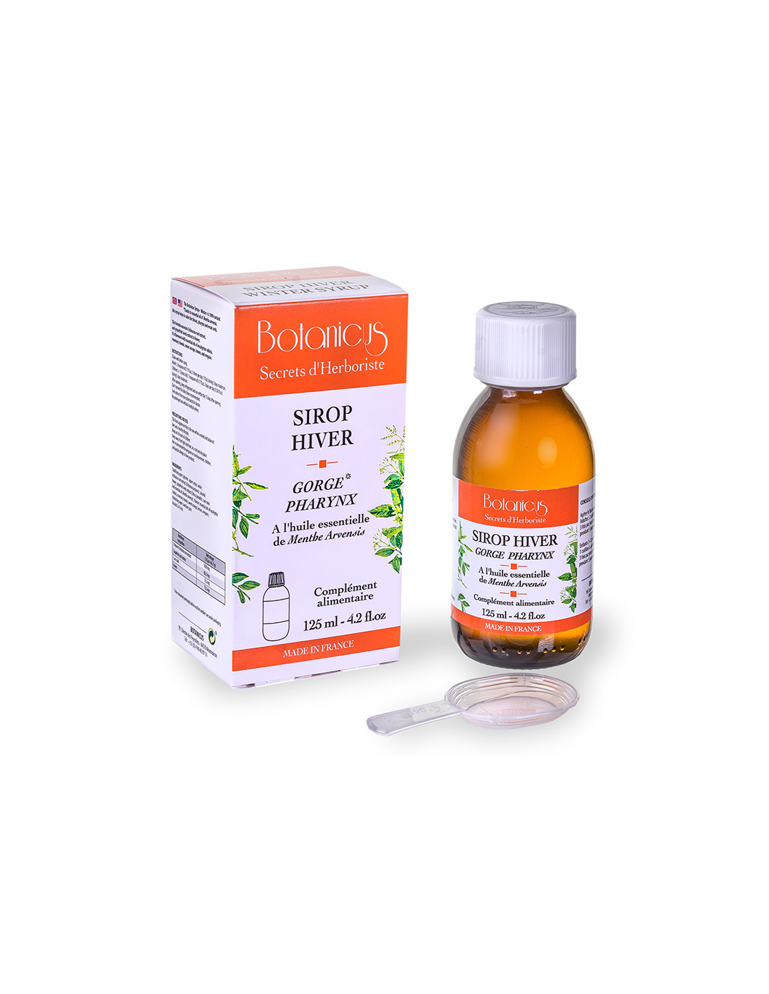 Stabilisant : Glycérine ; Sirop d’agave ; Eau ; Extrait de racine d’échinacée (Echinacea purpurea), Alcool, Miel, Extrait de pépin de Pamplemousse (Citrus x paradisi), Huile essentielle des parties aériennes de Menthe (Mentha arvensis) ; Arômes : huile essentielle de zeste d’Orange douce (Citrus sinensis), huile essentielle de zeste de Citron (Citrus limon), huile essentielle de feuilles et rameaux d’Eucalyptus (Eucalyptus radiata), huile essentielle de sommités fleuries de Romarin à cinéole (Rosmarinus officinalis), huile essentielle de sommités fleuries d’Origan (Origanum compactum). Epaississant : Gomme de xanthane.