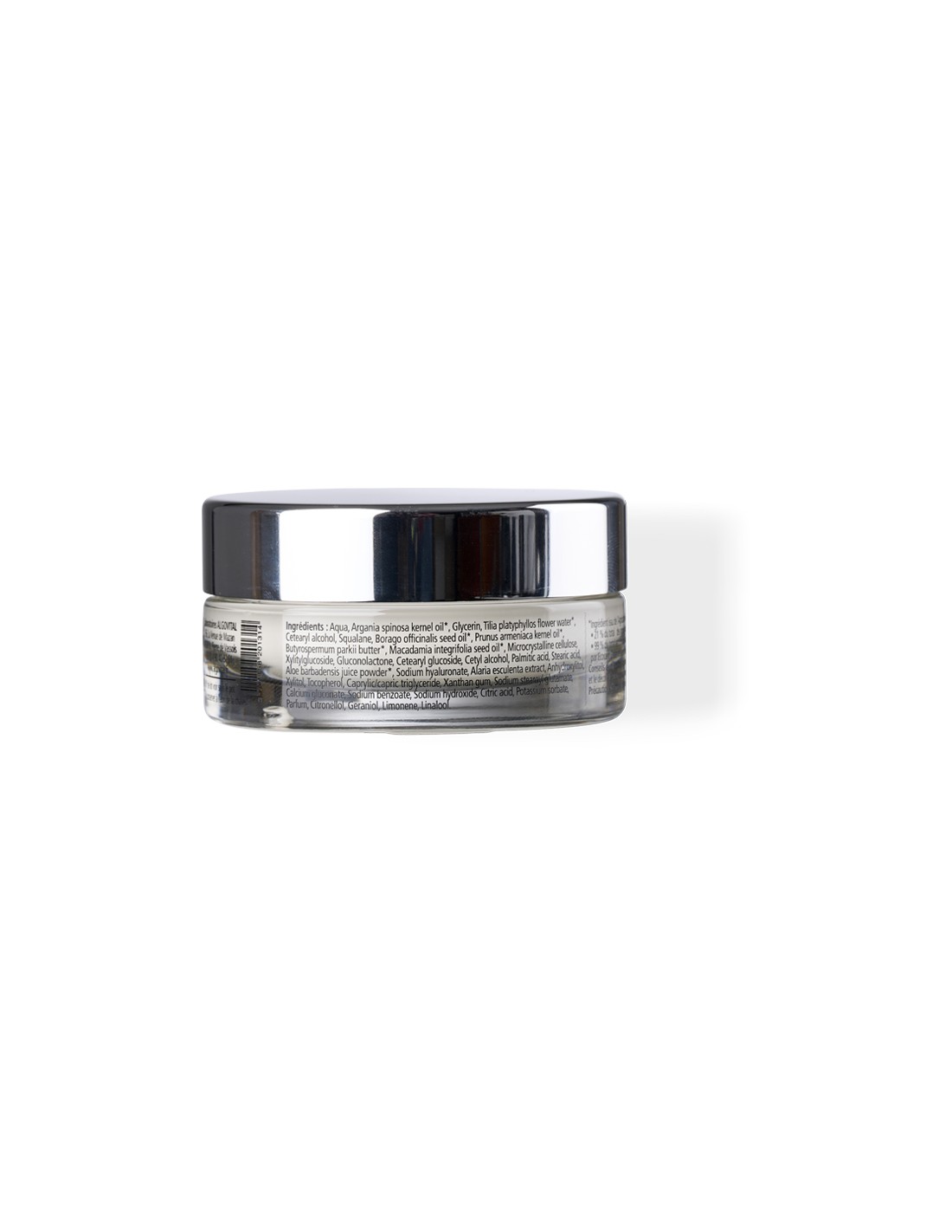 Aqua, Argania spinosa kernel oil*, Glycerin, Tilia platyphyllos flower water*, Cetearyl alcohol, Squalane, Borago officinalis seed oil*, Prunus armeniaca kernel oil*, Butyrospermum parkii butter*, Macadamia integrifolia seed oil*, Microcrystalline cellulose, Xylitylglucoside, Gluconolactone, Cetearyl glucoside, Cetyl alcohol, Palmitic acid, Stearic acid, Aloe barbadensis juice powder*, Sodium hyaluronate, Alaria esculenta extract, Anhydroxylitol, Xylitol, Tocopherol, Caprylic/capric triglyceride, Xanthan gum, Sodium stearoyl glutamate, Calcium gluconate, Sodium benzoate, Sodium hydroxide, Citric acid, Potassium sorbate, Parfum, Citronellol, Geraniol, Limonene, Linalool.