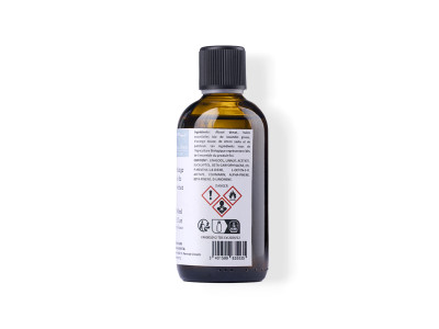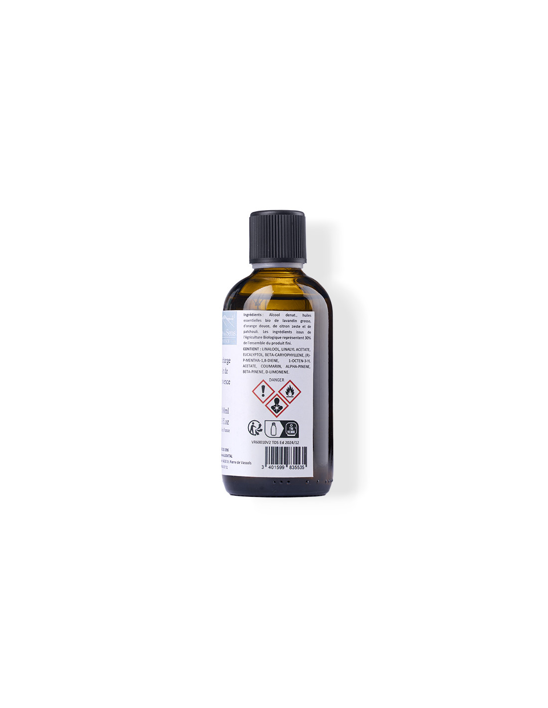 Huile essentielle de Lavandin Grosso bio, huile essentielle d’Orange douce bio, huile essentielle de Citron zeste bio, huile essentielle de Patchouli bio, alcool 96° bio