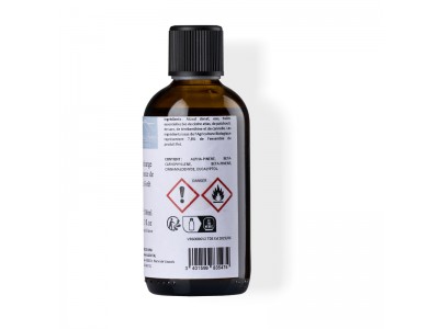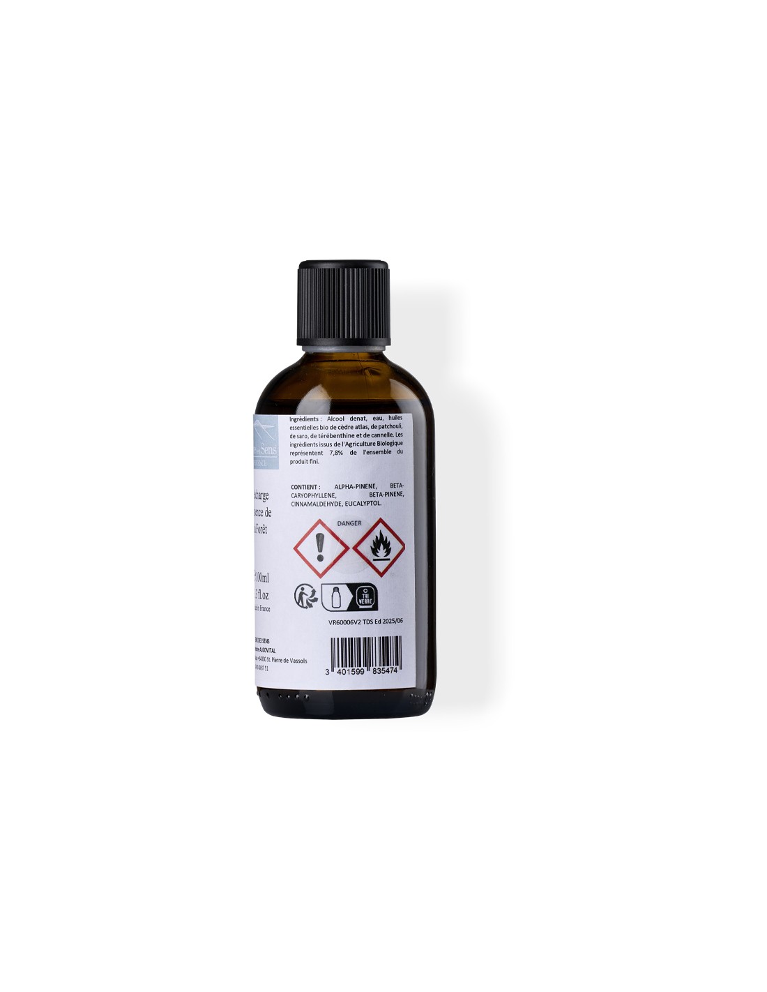 Huile essentielle de cèdre atlas Maroc bio, huile essentielle de patchouli bio, huile essentielle de saro bio, huile essentielle de térébenthine bio, huile essentielle de cannelle écorce bio, eau, alcool 96° bio.